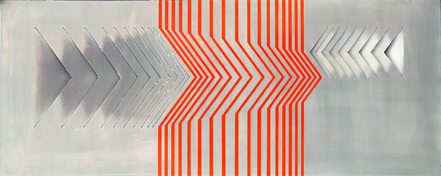 Auf Grundlage einer geometrischer Struktur habe ich Farbkompositionen auf Aluminiumtafeln mit Nitrolacken ausgeführt. Farbbänder, farbige Pfeile und Flächen ziehen über das Aluminium. Die Tafel selbst wird verformt: Schnitte in das Aluminium, die in einem bestimmten Rhythmus erfolgen, ermöglichen es, die entstandenen Dreiecke und Pfeile heraus zu biegen oder einzudrücken. Das darin sich spiegelnde Raumlicht lässt Räumlichkeit und je nach Blickwinkel Bewegung entstehen. So suchte ich die, auf einer strengen Geometrie ruhende, präzise Formensprache aufzulösen und in eine farbige bewegte Bildsprache zu überführen.